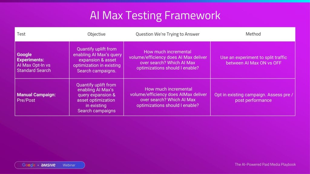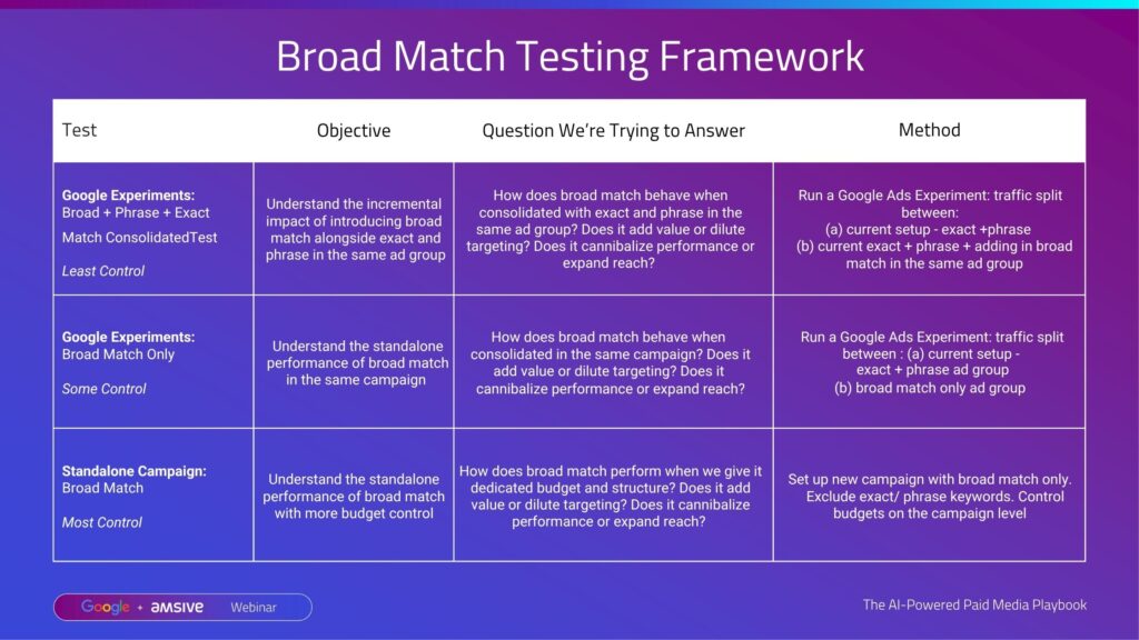 These frameworks aren’t either-or. Many advertisers layer them in stages. Build an AI-optimized foundation with Broad Match, validate cross-channel incrementality with PMax, then apply AI Max to push search performance further.