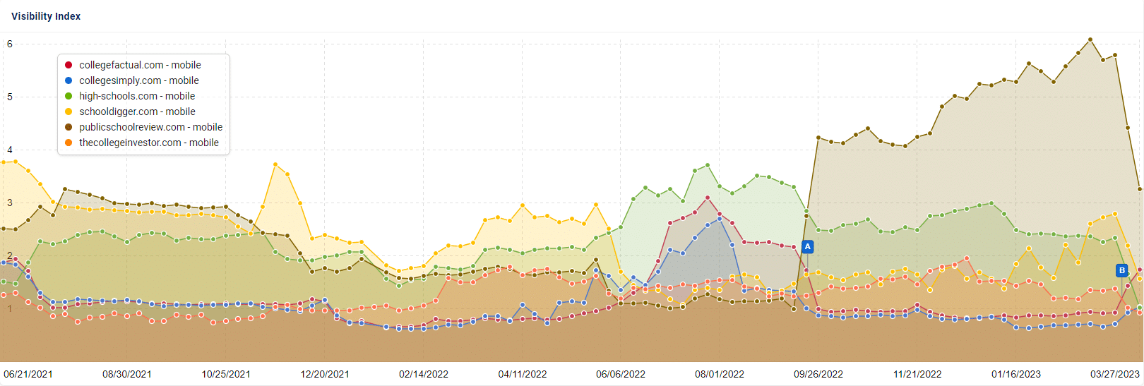 Below is a view of what some of those visibility changes look like during this update (the March 2023 Core Update is marked with the letter ‘B’):