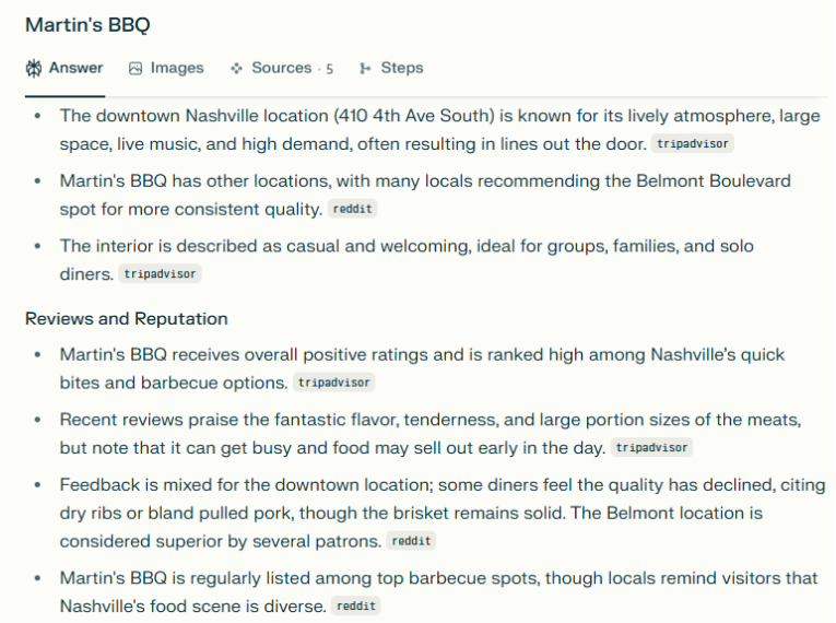 In other LLMs like Perplexity or ChatGPT, it’s not uncommon to see local or branded searches show similar experiences that cite Google Business Profiles, TripAdvisor, social media sites, Reddit, Yelp, and other trusted industry-specific sources are to offer insight regarding a business’s reviews and reputation. Reviews matter, and these experiences are continuing to showcase the importance of understanding what customers are saying about your business online.